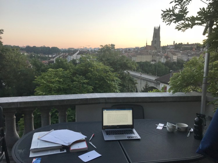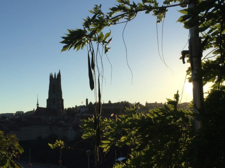 Essayons : Fribourg le soir. Pas encore by night. Juste avant. Le soir. L’agitation cesse – ou commence – sommes-nous lundi sommes-nous samedi – les marcheurs sont moins pressés. Freiburg am Abend. On parle plus doux – ou plus fort – sommes-nous dimanche sommes-nous jeudredi – c’est l’heure où l’on commence à se dire les choses qui comptent – pas celles qui comptent les sous – les mots qu’on a ruminés toute la journée en se disant et en se redisant ce soir il faut que je lui dise c’est important qu’elle comprenne c’est l’occasion ou jamais – le soir, on est mieux luné pour écouter – ou alors c’est pire le soir que le jour elle dit écoute chéri je suis crevée on en reparlera demain qu’est-ce que tu as dit attend la mi-temps mais putain pourquoi ils mettent la musique si fort. Tout ça, les mots qu’on dit et les mots qu’on retient, c’est le soir universel, le soir de partout, mais qu’est-ce que c’est que le soir à Fribourg ? Qu’est-ce qui fait que le soir à Fribourg, c’est le soir à Fribourg, pas le soir à Neuchâtel, pas le soir à Londres, pas le soir à Ouagadougou ? Le soir à Fribourg, comme le soir partout, c’est une multitude de soirs. Mais le soir typique, c’est quoi, à Fribourg, le soir made in Fribourg ? Et le soir quand d’abord ? le soir en été ? le soir en hiver ? le soir en octobre ? le soir un mardi, un dimanche, à la pleine lune, sous la pluie ? Au bol : un samedi soir. Il se passe plus de choses le samedi soir que les autres soirs, ce n’est pas plus typique mais c’est plus esthétique, on peut plus facilement faire de la littérature ou croire qu’on en fait, un samedi soir en été sur une terrasse. N’importe quelle terrasse, on détaillera plus tard. Une terrasse à Fribourg un samedi soir. Des gens – des jeunes, des vieux, des hommes, des femmes, des enfants, des chiens, des pigeons et des guêpes ; même le soir, en été, les guêpes – des gens qui sont assis sur une terrasse à Fribourg un samedi soir. Sur toutes les terrasses du monde, des gens sont assis le samedi soir. Les gens de Fribourg ne sont pas plus mal ni mieux assis que les gens de New-York – peut-être que si, c’est moins pollué à Fribourg qu’à New-York – ou que les gens de Montagny-la-Ville – peut-être que non, il avait l’air si heureux, grand-papa, assis sur son banc à Montagny-la-Ville – non, les gens de Fribourg sont assis de la même façon que les gens de partout ailleurs sur la terre. D’ailleurs, ils ne sont pas tous assis. Les enfants, les chiens, les pigeons et les guêpes ne sont pas assis. Ils courent, ils volent, ils jappent, ils roucoulent, ils bourdonnent, les enfants, les chiens, les pigeons et les guêpes. Les hommes et les femmes par contre sont assis, surtout les vieux hommes et les vieilles femmes.