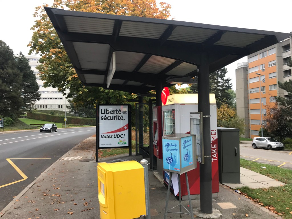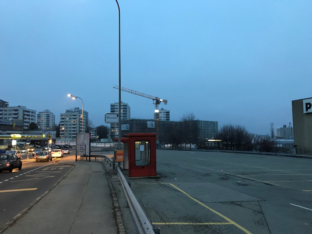 Sinon : deux ou trois types qui bossent, un peu plus qu’à la Vignettaz mais à peine, A. Page Aménagements et fournitures de bureaux Büroeinrichtungen und bedarf, Auto-Fournitures Suzuki, Meuwly Pneus, ProfilSport votre spécialiste ski-vélo, une blanchisserie et une boucherie. La poste ? Fermée, la poste, comme partout. Et devant ce qui fut la poste : une cabine téléphonique sans téléphone mais pas encore customisée parce que la boîte à livre est à l’intérieur, à côté de la boucherie Papaux, alors la cabine téléphonique on la laisse comme ça, en souvenir, ou juste parce qu’on l’a toujours vue là et qu’on a oublié de l’enlever, elle fait partie des meubles, la cabine téléphonique.